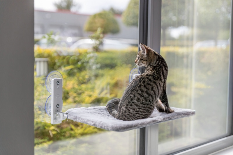 Window Perch, plush/mesh fabric, foldable, 58 × 34 cm, white/grey